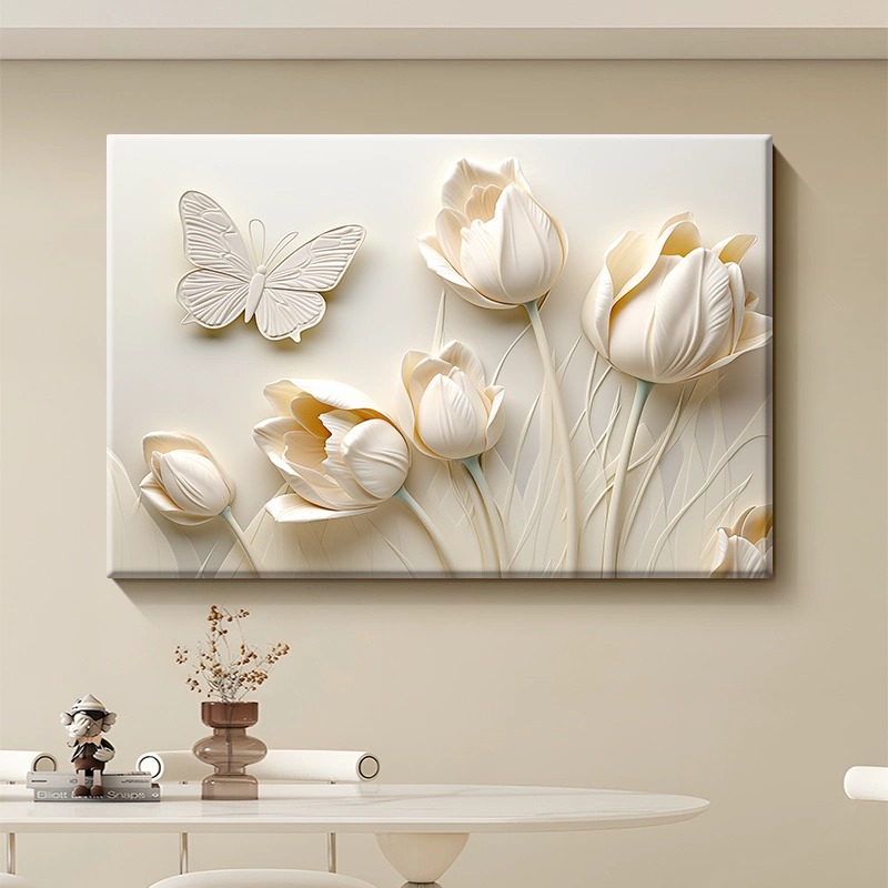 奶油风郁金香餐厅装饰画肌理抽象花卉蝴蝶餐桌高级感背景墙壁挂画