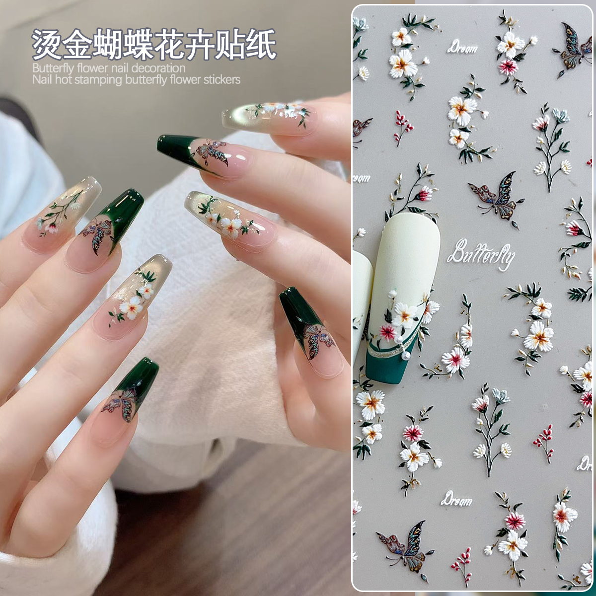 【菊籽老师推荐】烫金蝴蝶花卉美甲贴纸白花蝴蝶浮雕指甲装饰贴花