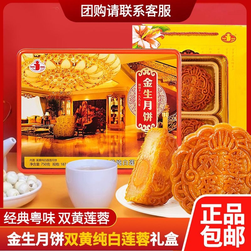 750g双黄蛋黄纯白莲蓉月饼广式中秋节老式传统糕点特产赠送礼盒装