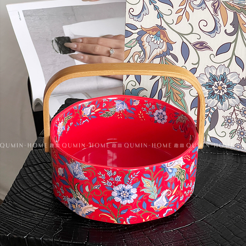 复古原创设计风铃花陶瓷水果提篮零食干果收纳高颜值家用茶几果盘