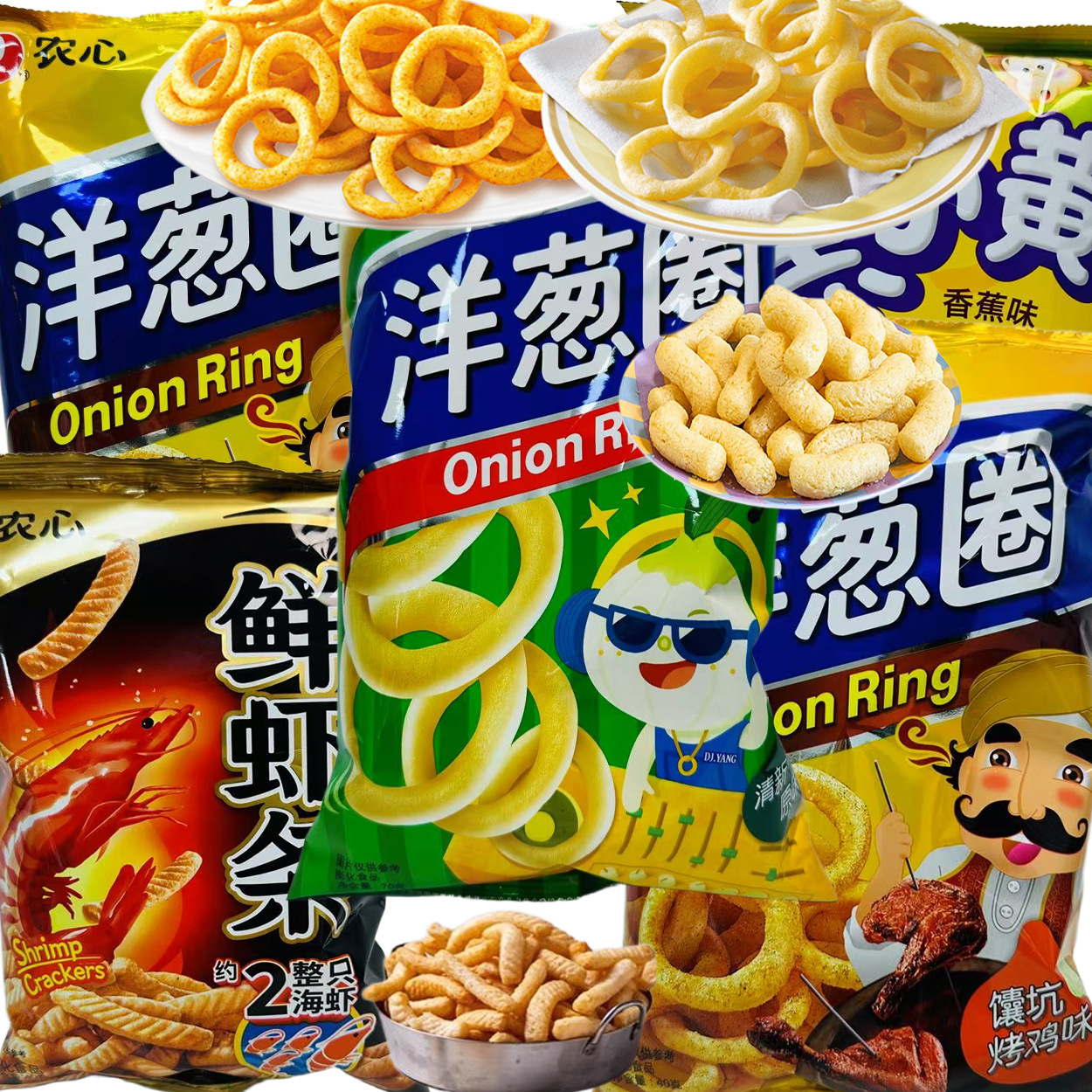 国产农心鲜虾条90g原味洋葱圈70g膨化香脆零食非油炸小麦粉制品