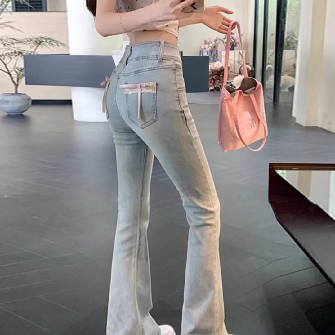 蝴蝶结设计修身显瘦微喇牛仔裤女春季美式高腰弹力马蹄喇叭裤
