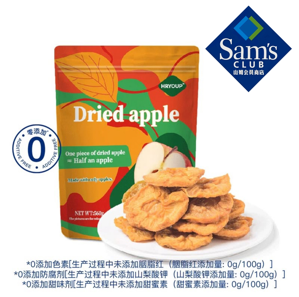 山姆超市代购HRYOUP苹果干片0添加0脂肪水果干单独小包装零食560g