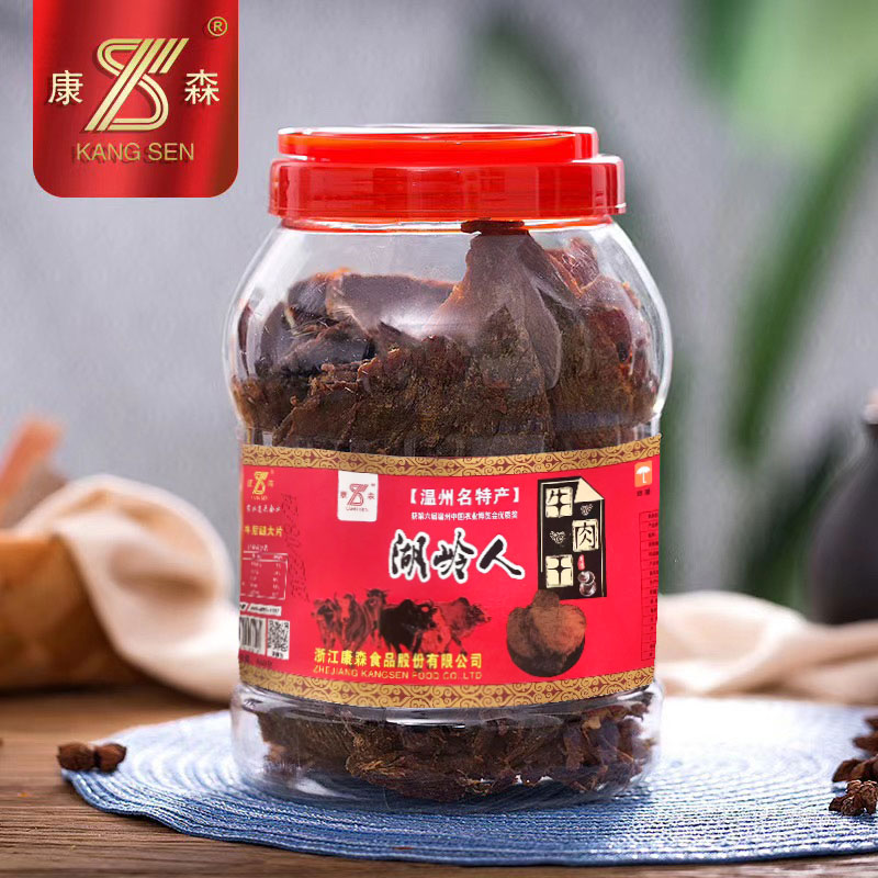 包邮温州正宗康森湖岭新垟滩牛肉干大片桶装毛重500g