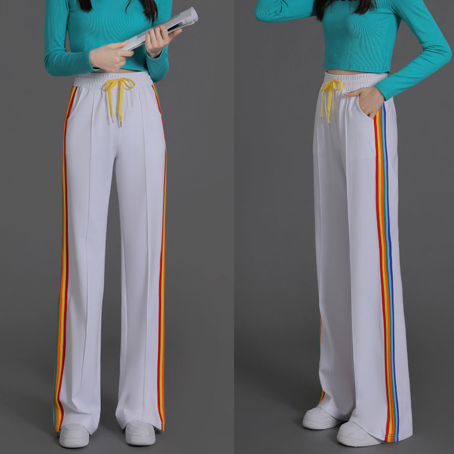 白色韩版高腰阔腿女春夏薄款休闲运动条纹坠感宽松直筒健身舞蹈裤