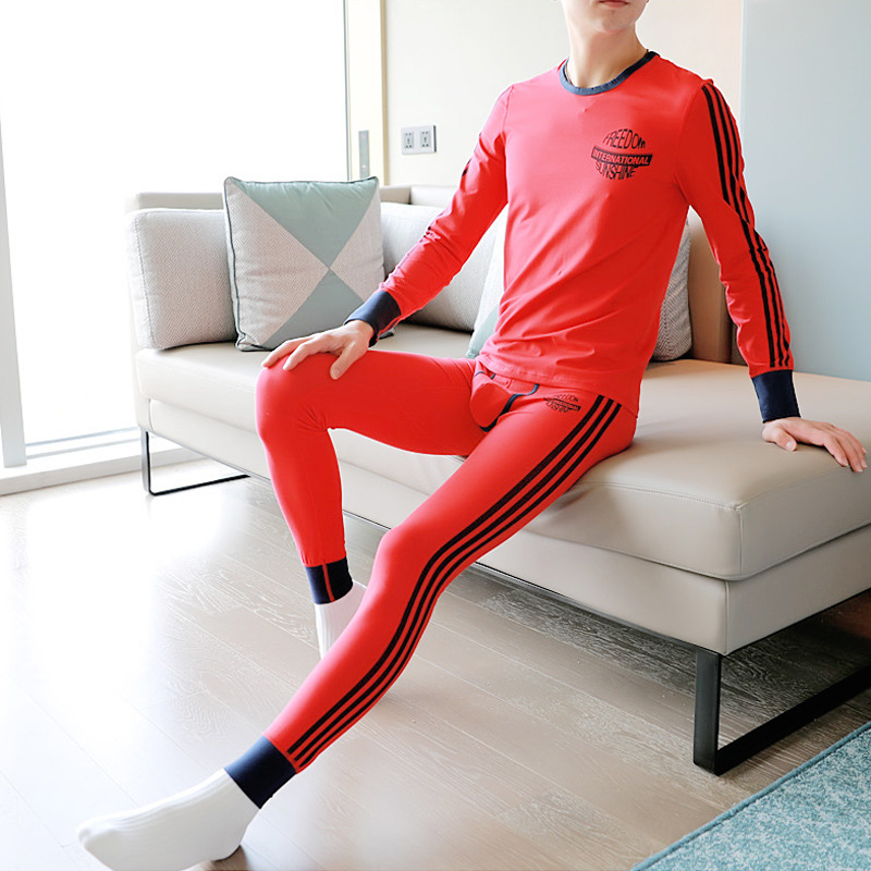 男士亲肤V领保暖内衣套装薄款弹力紧身红色长袖打底衫男秋衣秋裤