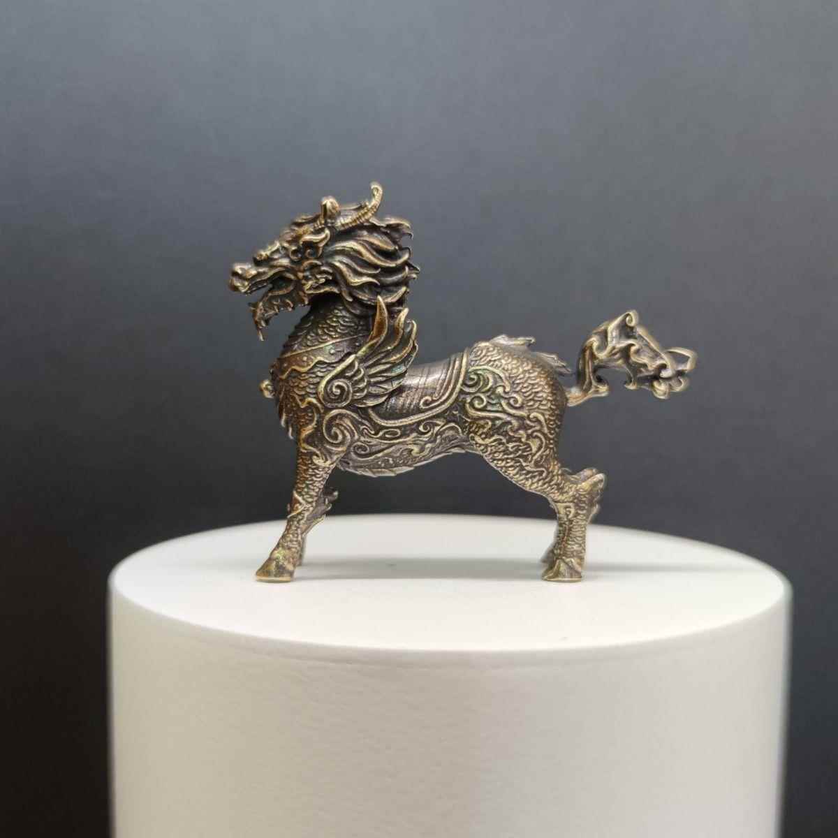 仿古紫铜色包浆长尾麒麟座兽摆件杂项收藏家居装饰工艺品摆件