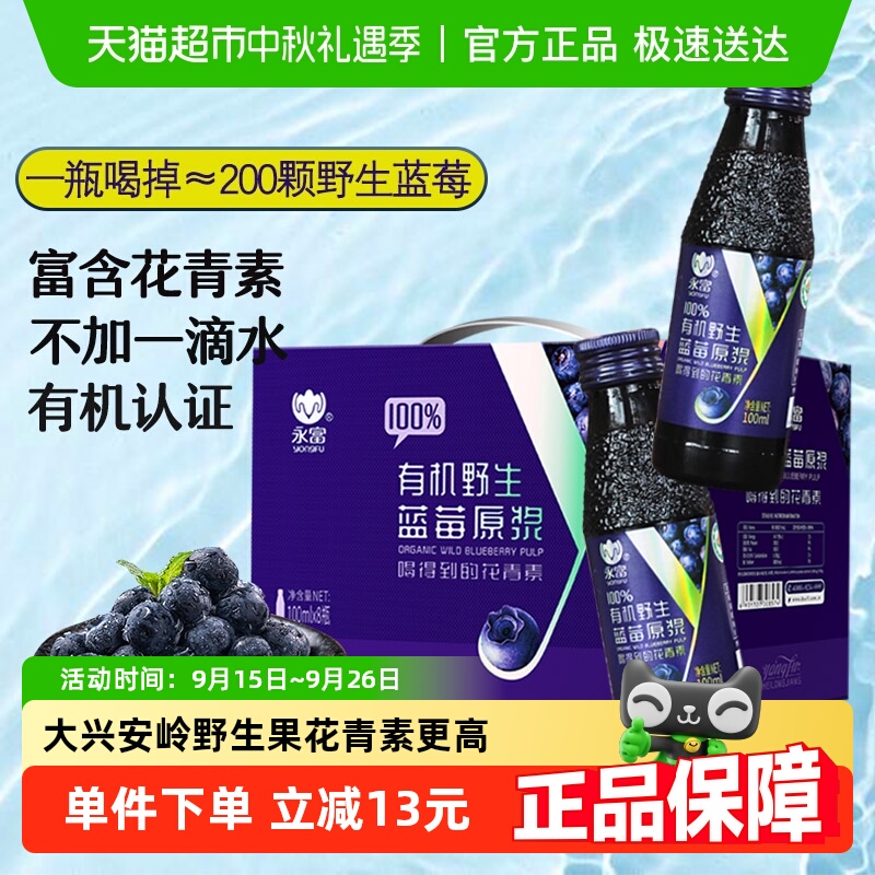 「花青素」永富100%大兴安岭有机野生蓝莓原浆100ml*8瓶中秋礼盒