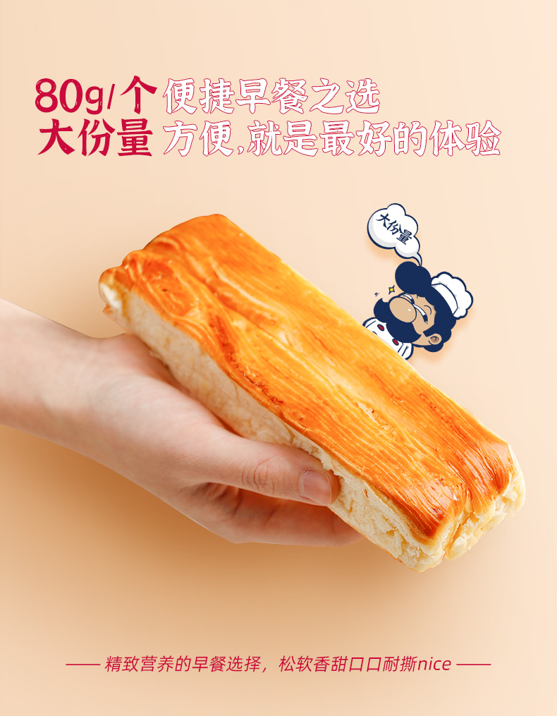 早餐抗饿实力派金黄绵软细腻,清甜奶香好撕更好吃层层香软大小适口,绵密清甜入口即溶,优选中粮小麦粉口感细腻更有弹性,冷冻发酵起酥,面包蓬松更香软油片折叠起酥.