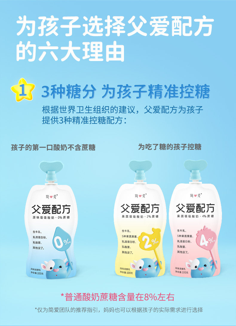简爱创始团队的爸爸们和3000个家庭,为我们的孩子共创0%、2%、4%精准控糖的“父爱配方”系列酸奶,根据世界卫生组织的建议,父爱配方为孩子提供三种精准控糖配方~