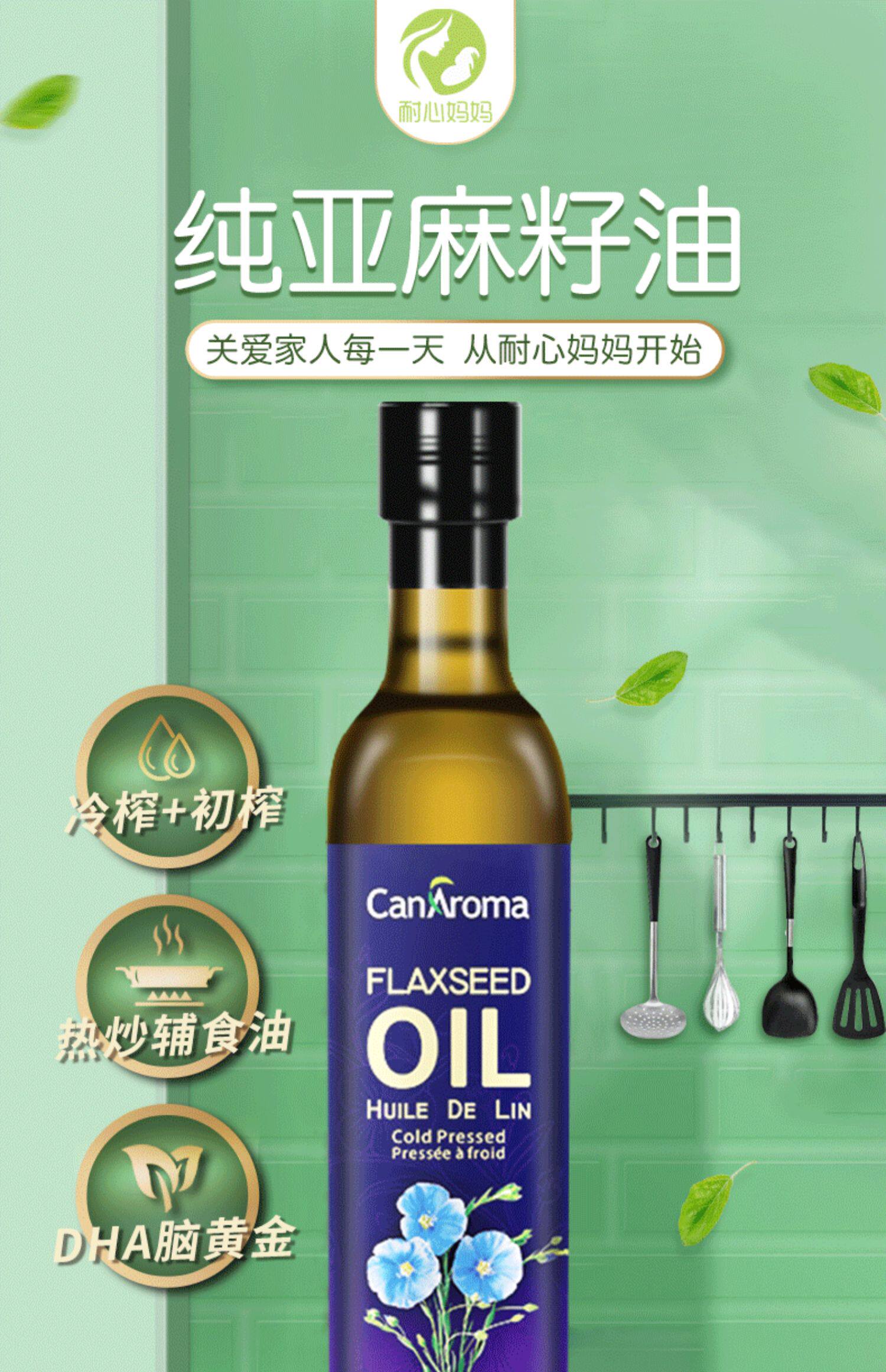 【canaroma耐心妈妈】加拿大进口纯亚麻籽油,原装进口,亚麻酸含量丰富,层层压榨工艺,提炼健康好油,胃口和营养兼顾,口味清淡,好接受更易吸收!多方面助力宝宝健康成长!宝妈们,快快抢购吧!!!