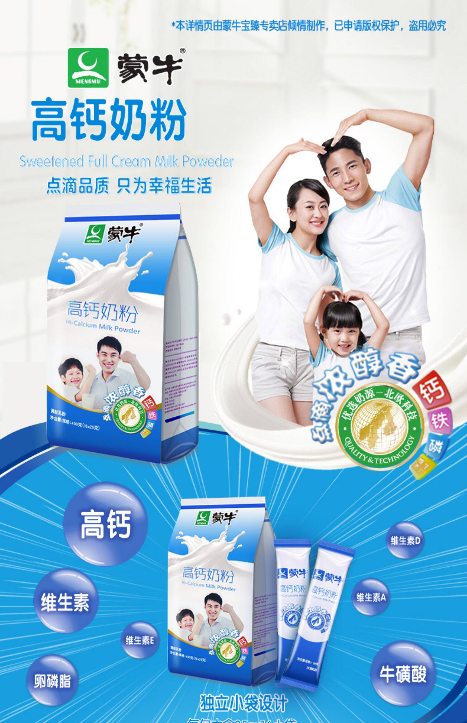 蒙牛高钙奶粉400g,全家营养补钙早餐,采用优质奶源,品味香浓,品质安心,点滴品质只为幸福生活。