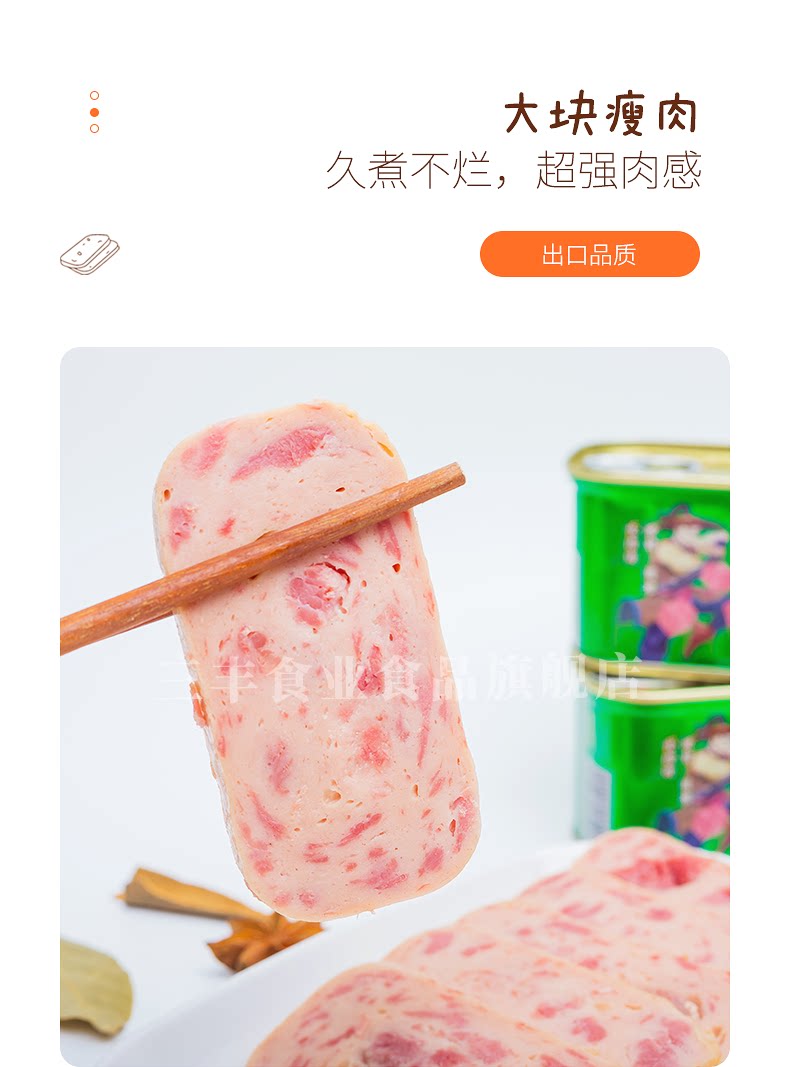 【90%的猪肉含量~】专注午餐肉30年,好吃到爆!满满肉粒看得见,不添加任何防腐剂!精选优质猪肉为材料,口感Q弹,不管是涮火锅,还是早餐煎着吃,贼好吃!超多吃法等你来解锁~比梅林好吃N一百倍!!