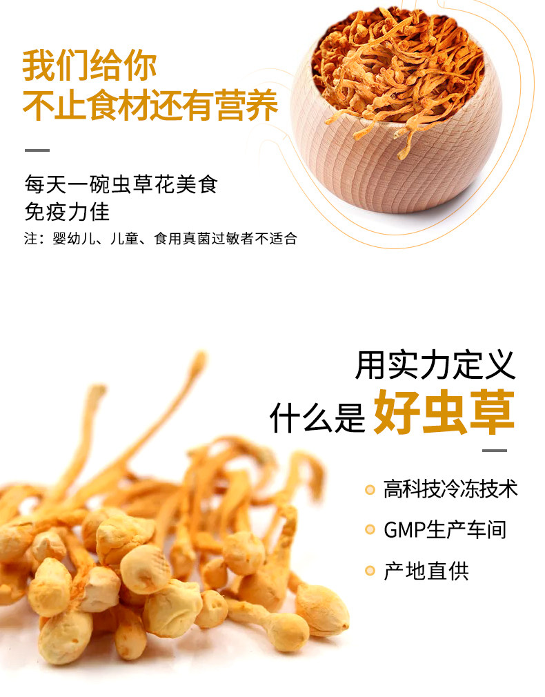 精选大孢子头虫草花干货130g,新鲜无硫,药厂标准,子实饱满,味浓滋补!用实力定义好虫草,给您的不止是美味,还有健康和营养!!
