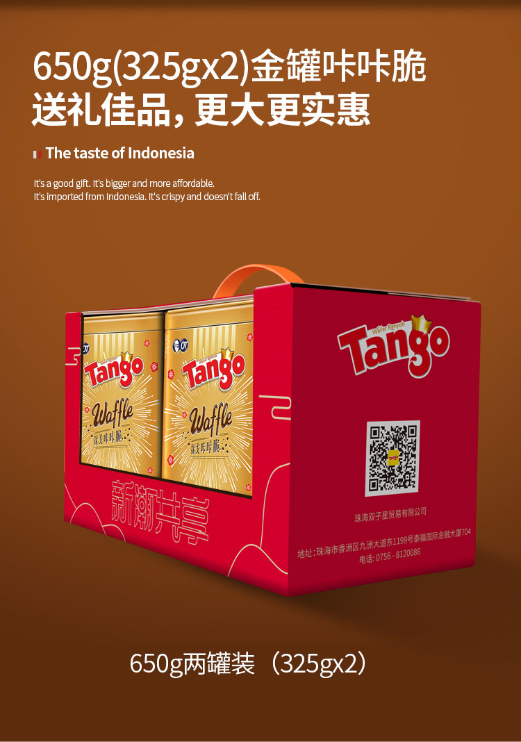 Tango印尼进口巧克力味咔咔脆,夹心威化饼干金罐,严选食材,精工细作,好原料自然好味道,浓醇馥郁,一口下去吃到的不止一种香脆~随时随地享受美,325g零食礼盒送礼,高档包装,自用送礼都适宜。