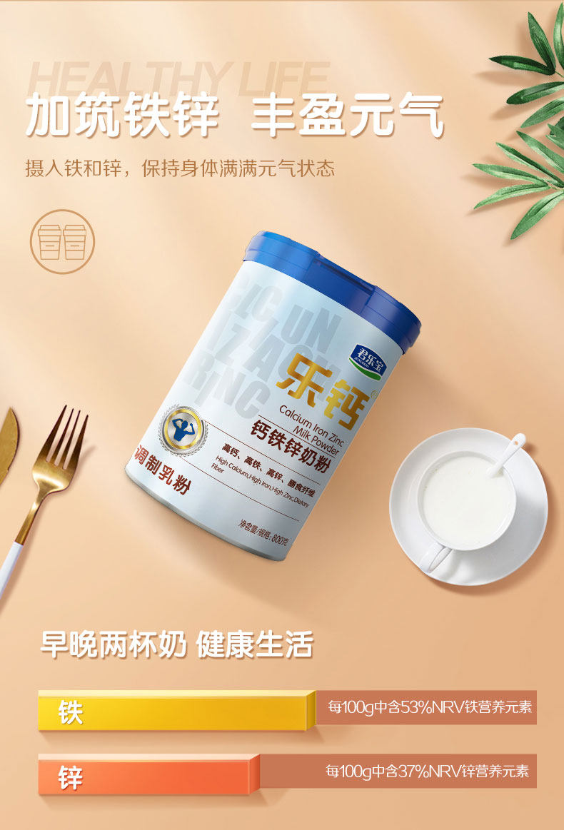 拍2件!乐钙钙含量超出高钙标准3倍多,呵护骨骼!摄入铁和锌,保持身体满满元气状态!富含膳食纤维,有助于维持正常的肠道功能,动力十足!老人儿童都能喝,陪伴全家人的营养!