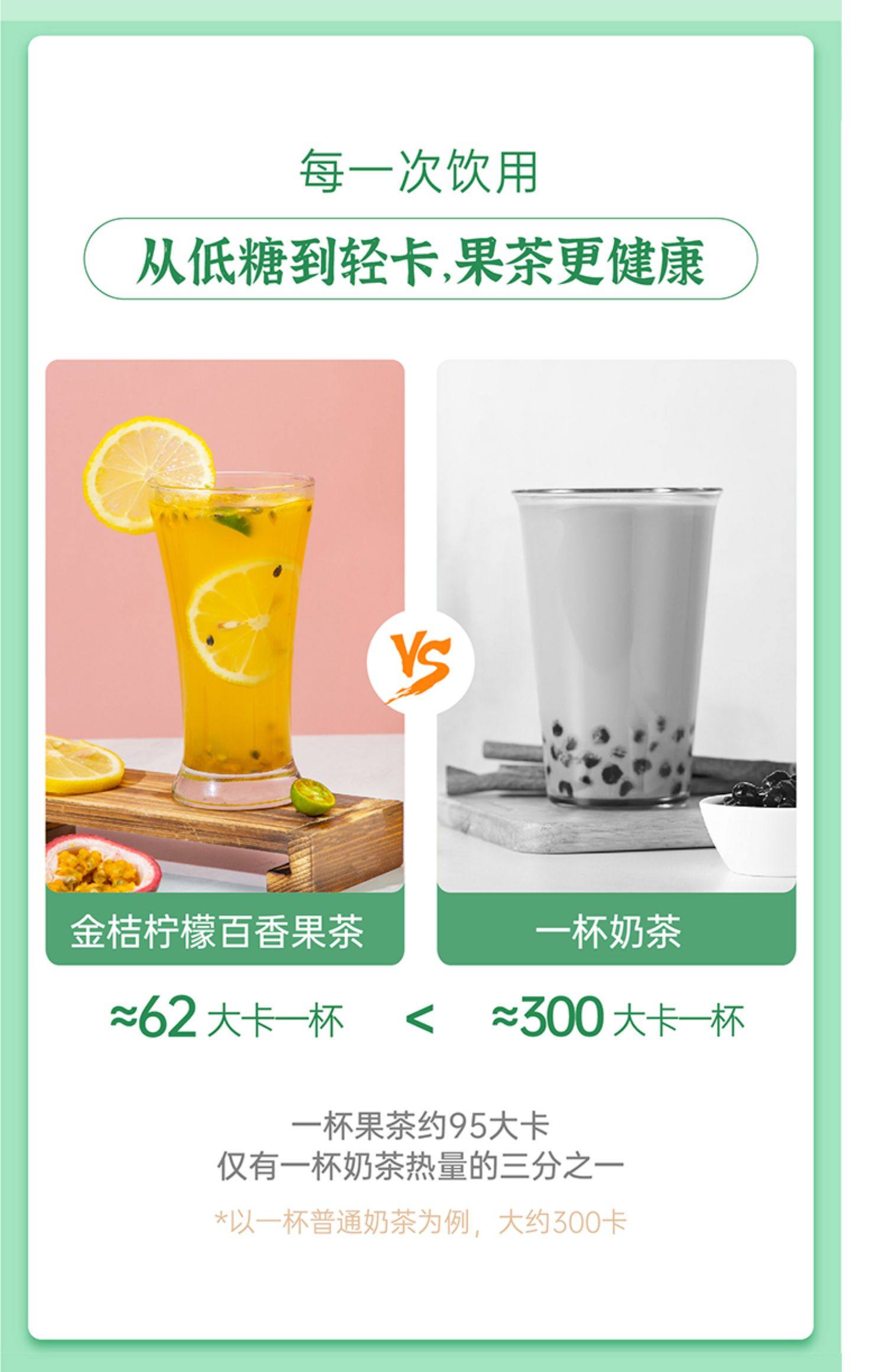 金桔柠檬百香果茶饮品水果茶添加百花蜜【劵后39】无糖精色素防腐剂等添加剂,看得见的大块果肉!可润肺降火、嫩肤养颜,增强免疫力,更营养,更新鲜,更好喝,每天一杯带来甜蜜好心情。