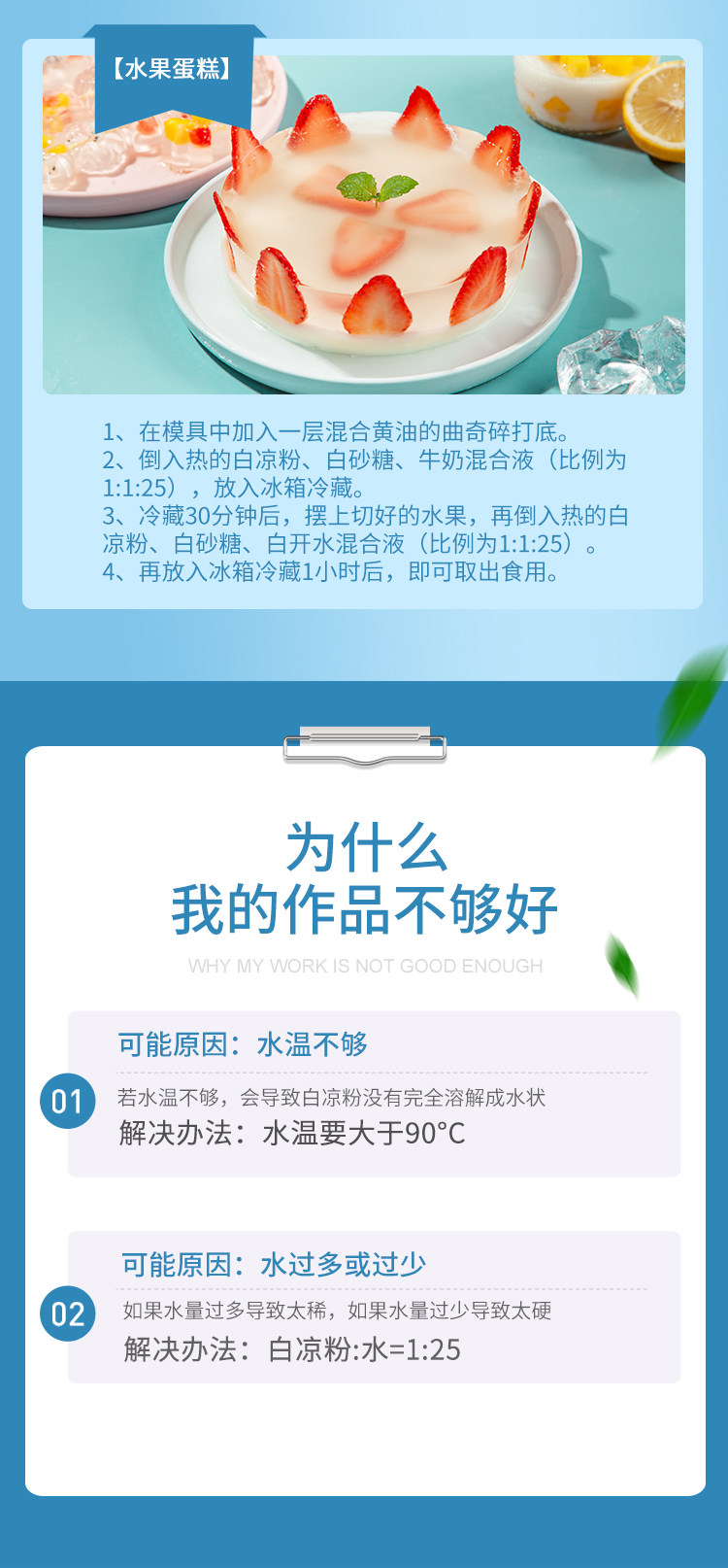 你的夏日甜品站,制作简单,百搭百配,可做多种凉粉,凉糕,果冻,操作简单方便!冰凉爽口十分解气~晶莹剔透,口感爽滑,可搭配多种水果制作,依个人口味做出喜欢的味道!