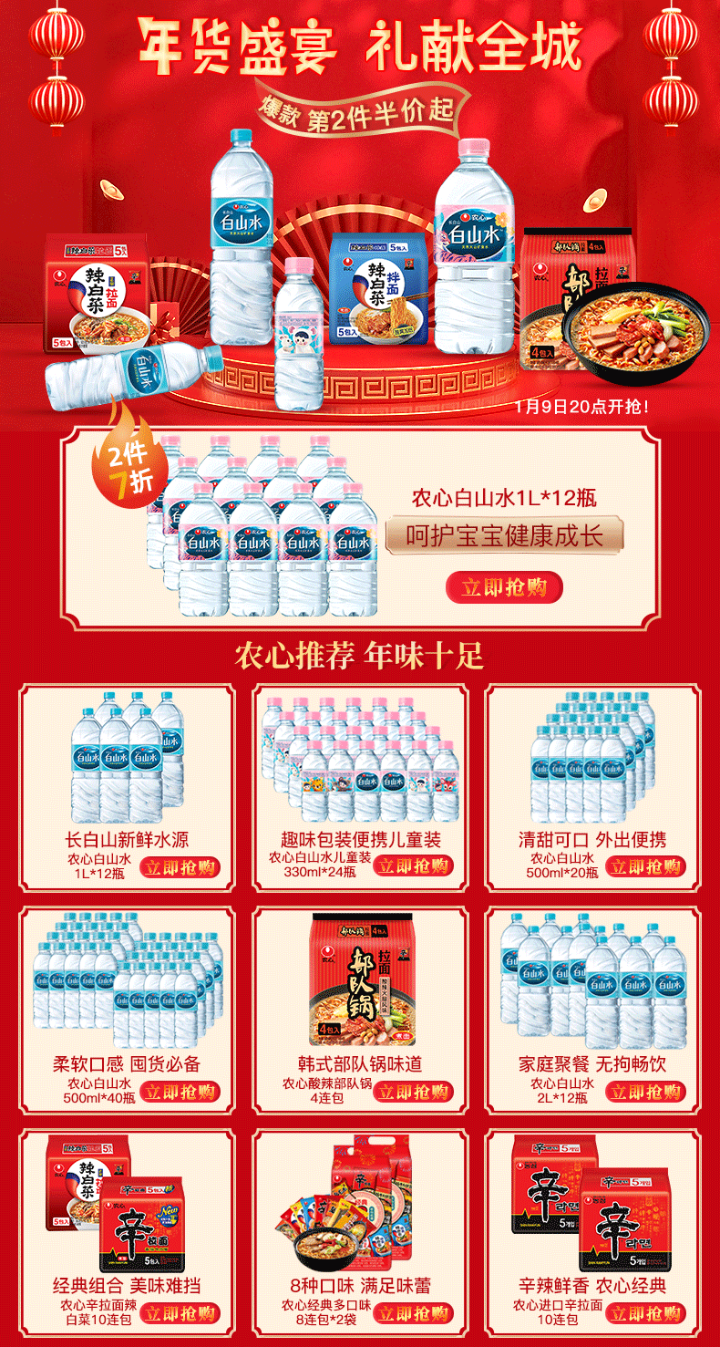 农心白山水天然饮用纯净矿物质水2L*12瓶