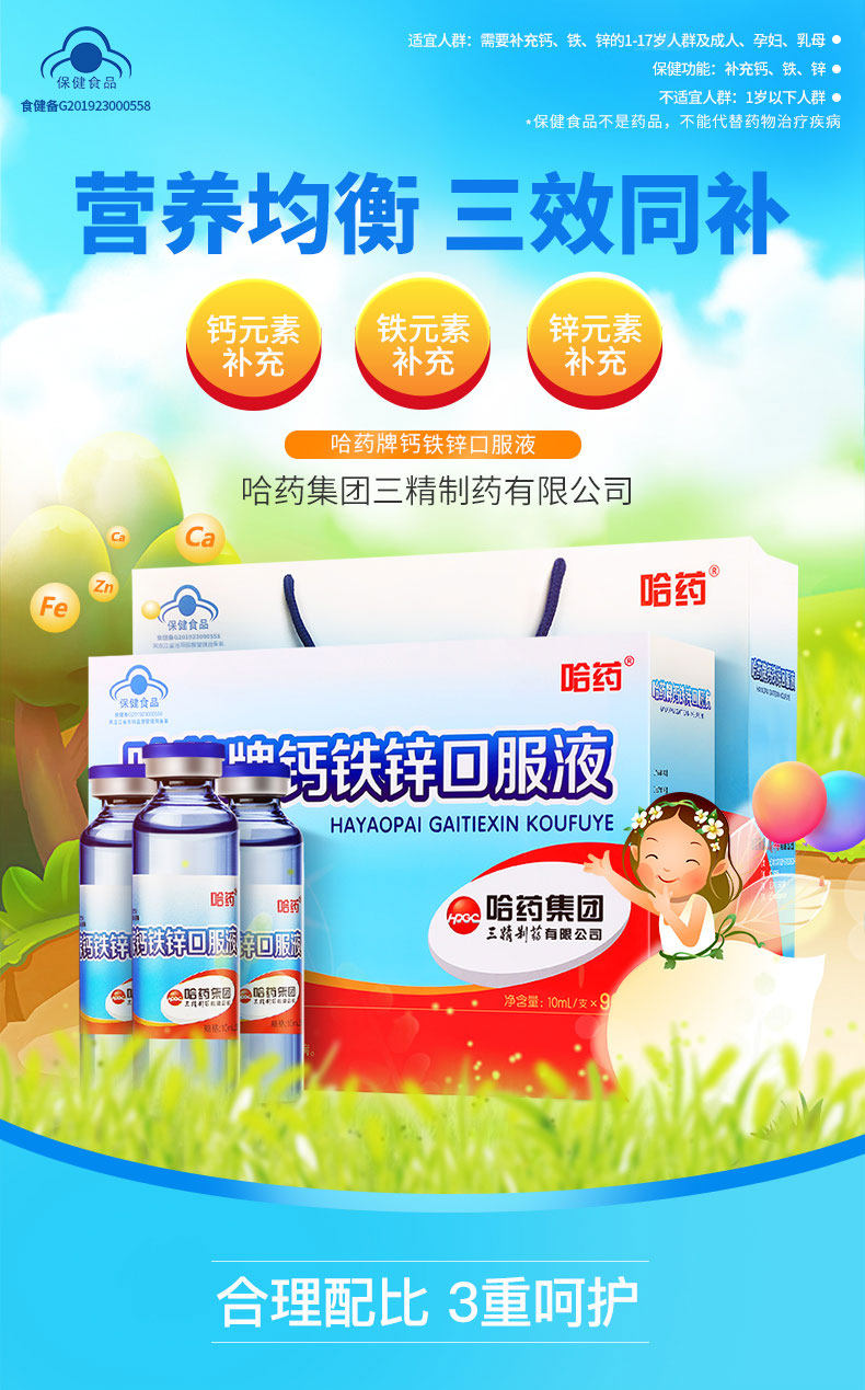 哈药牌钙铁锌三精蓝瓶口服液90支