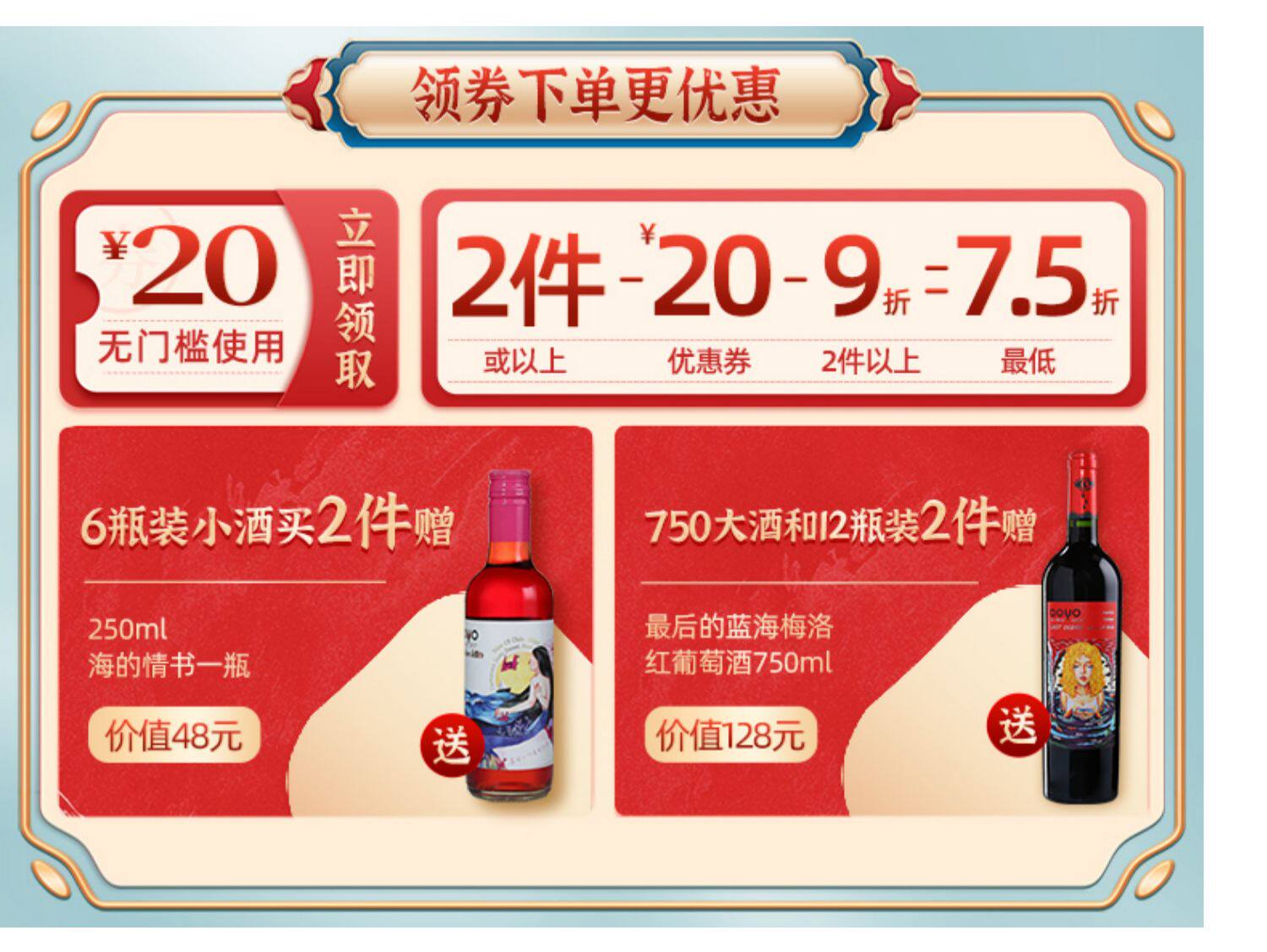 满两件送红酒一瓶