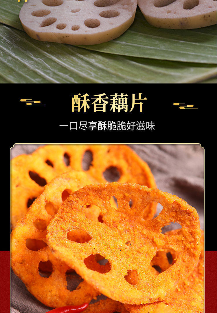 香辣藕片,网红休闲小吃,口味多样,新鲜辣爽,所有藕片均采用上好的新鲜湖藕,采用传统工艺进行腌制,用30多种植物香料调制的作料拌匀,让每一片藕都是香辣爽口,回味无穷。