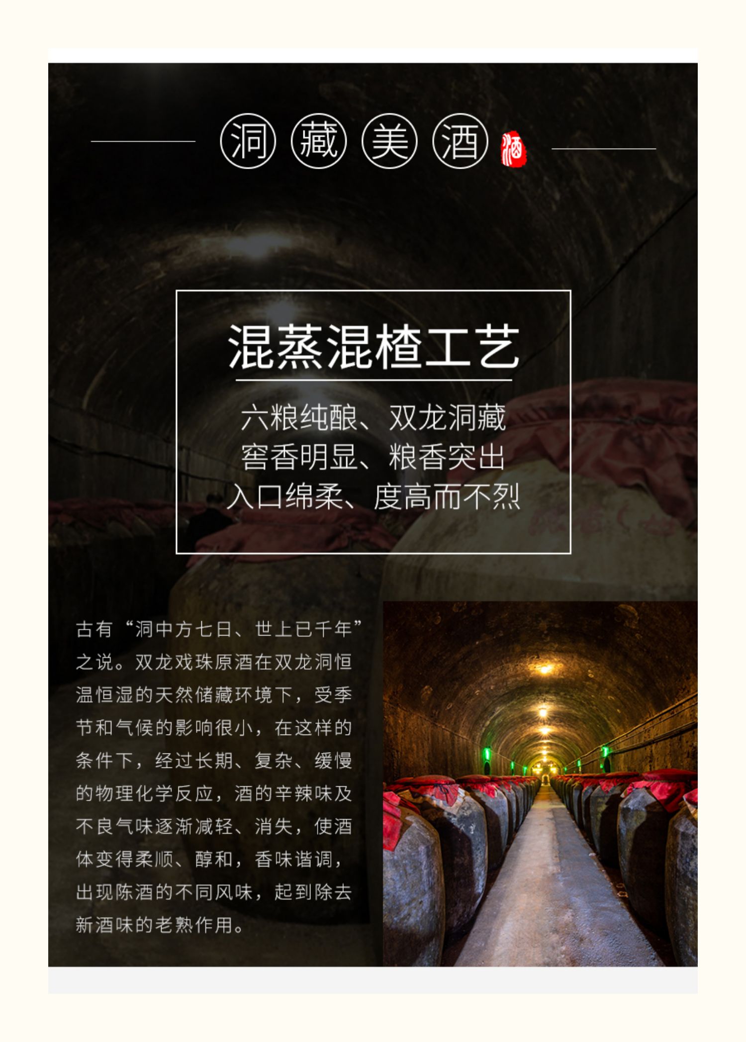 【双龙戏珠】混蒸混楂工艺,六粮生态酿造、双龙洞藏,窖香明显、粮香突出,度高而不烈,窖香舒适、入口和顺绵甜,多粮风格典型!送礼自饮都可以!