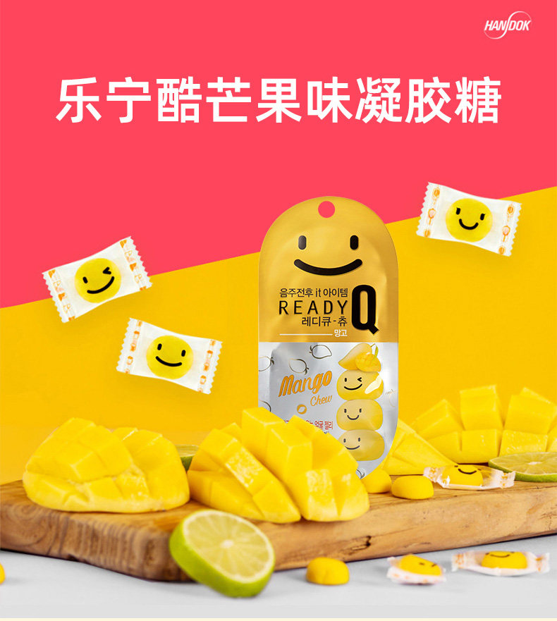 【领平台券满159-20】乐宁酷Readyq芒果味解酒糖笑脸糖凝胶软糖,宿醉不头疼,健康又好吃的乐宁酷,美味的芒果味,可毫无负担地享受的有嚼劲的软糖