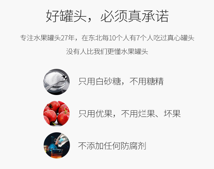 【真心罐头】好罐头必须好原料,每一颗果肉都是人工手选,锁住新鲜,可以闻到果园的香气,新鲜度不亚于鲜果,更丰富的营养成分,缤纷果味,浓郁诱惑。