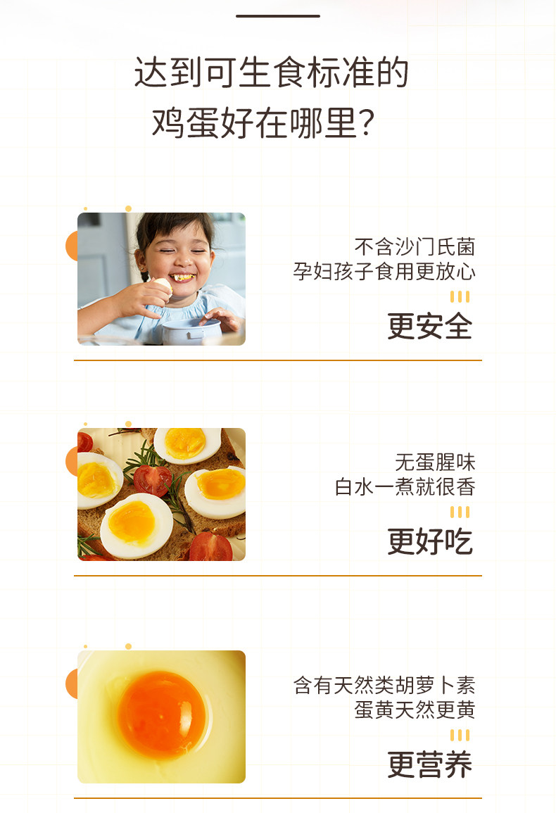 【超值,淘金币抵扣后价格更实惠!】无激素农残,无沙门氏菌,无大肠杆菌!蒸、煮、煎、炸都好吃~蛋黄个大,色泽黄,蛋清粘稠~煮后蛋白有弹性,蛋黄软糯无腥味~
