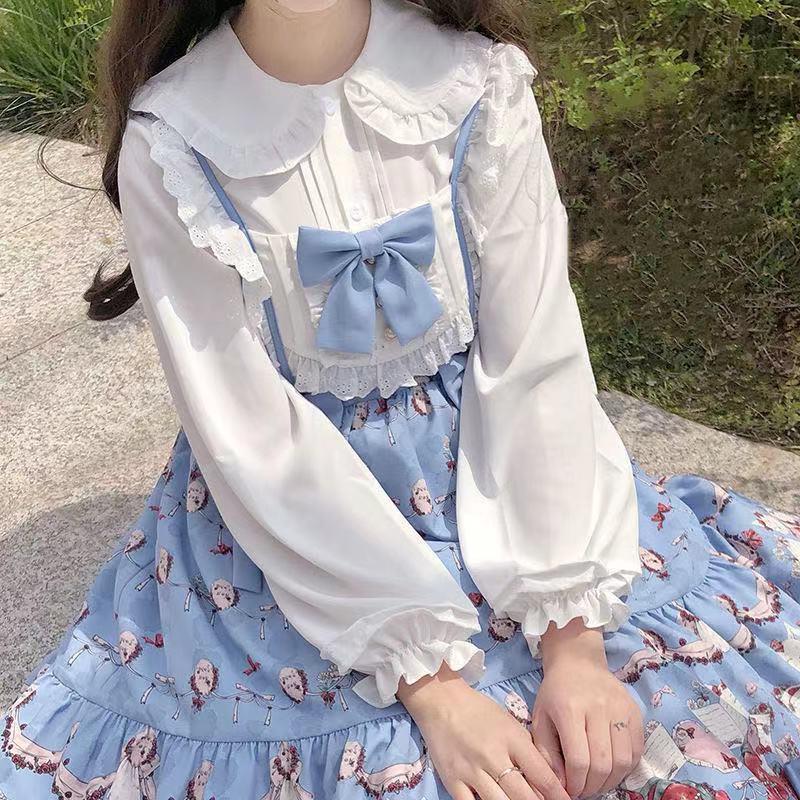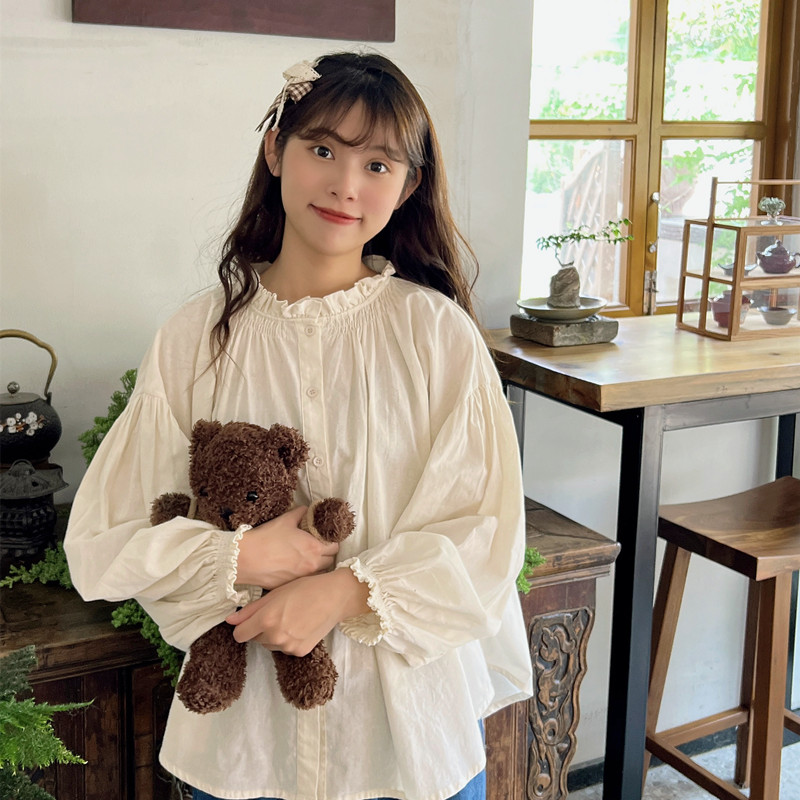森系温柔蕾丝荷叶领叠穿灯笼袖宽松衬衫纯棉日系打底娃娃衫上衣