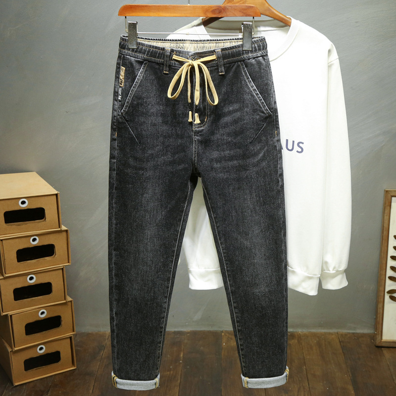 2025秋冬新款男式学生弹力松紧腰抽绳复古灰色束脚运动哈伦牛仔裤