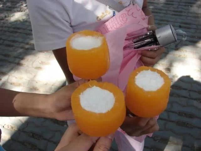 2.第二种雪糕是外面是橙子味道的冰棒,冰棒里面是白色香甜的雪糕,很多孩子都喜欢先吃掉里面一层白色的雪糕,然后再吃外面一层冰棒,香甜又十分解渴
