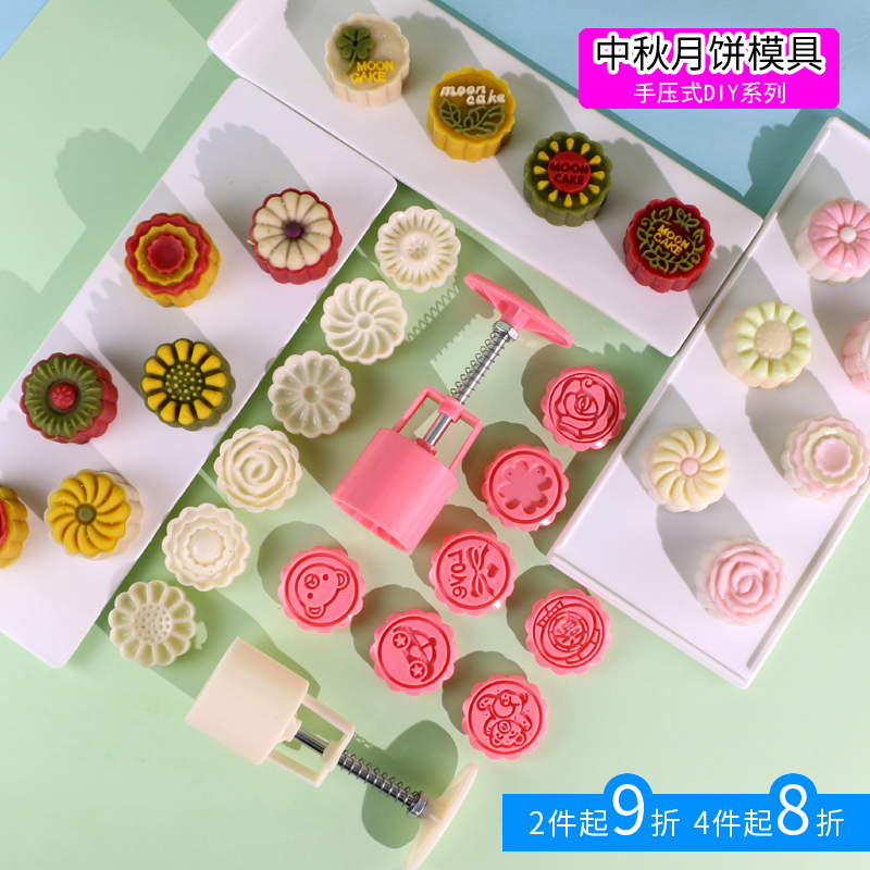 中秋月饼模具手压式套装50-100G圆形卡通绿豆糕烘焙月饼模具包邮