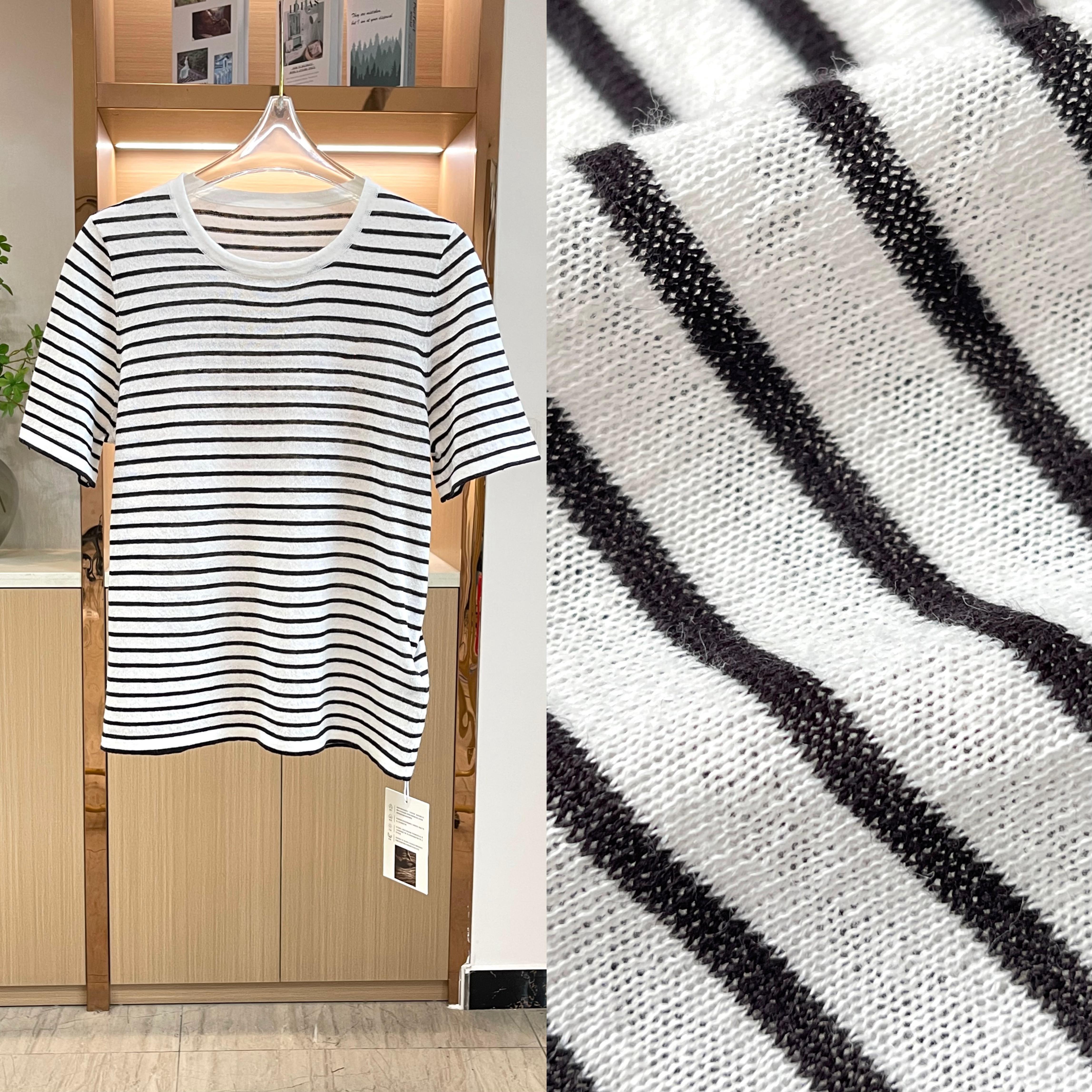 马仔刺绣 经典百搭条纹亚麻短袖 夏季新款女装0066(实际库存)
