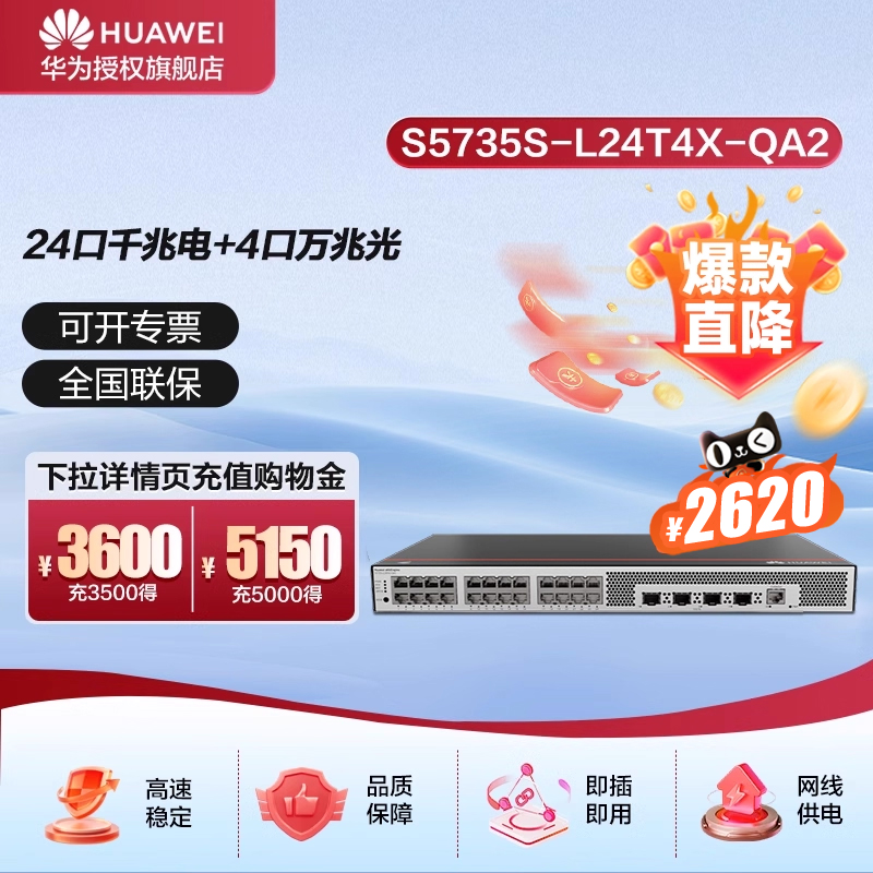 华为坤灵S5735S-L24T4X-QA2 万兆交换机24口千兆电4口万兆光弱三层全网管光纤网络 替S5720S-28X-LI-AC
