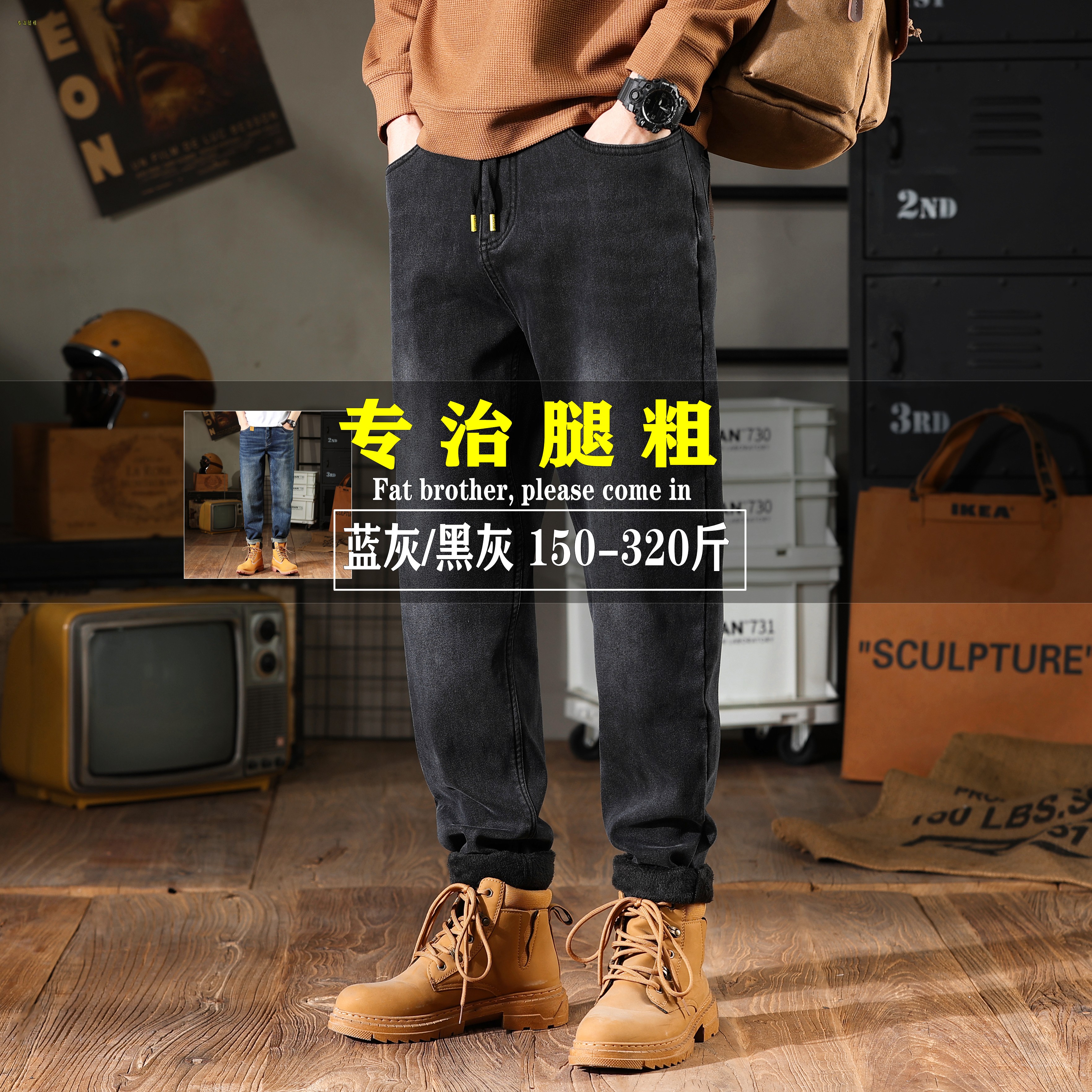 秋冬季牛仔裤男款大码高弹力宽松小脚加绒胖子加肥加大码厚款男裤