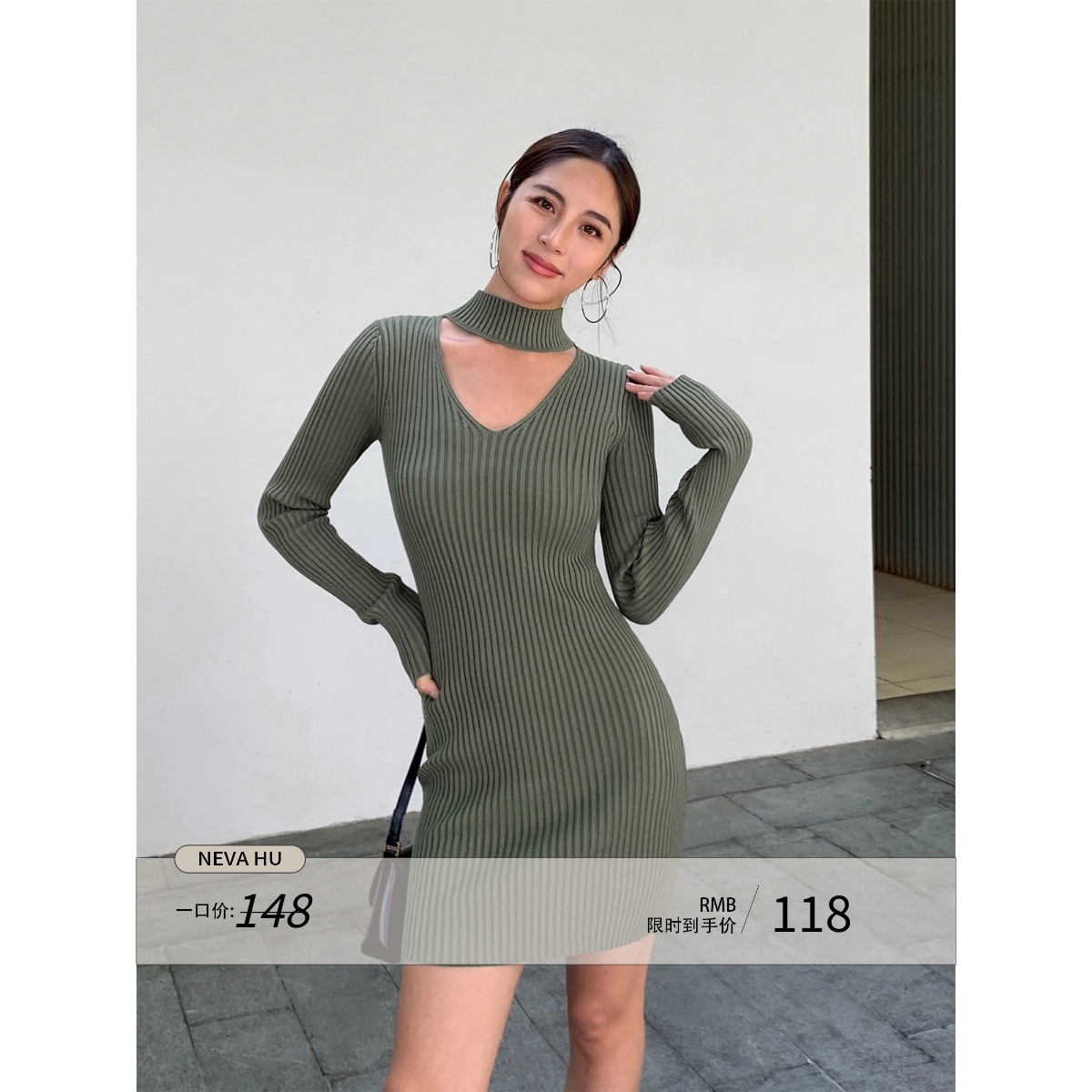NEVA HU黑色V领针织紧身连衣裙女2025修身显瘦性感辣妹包臀短裙