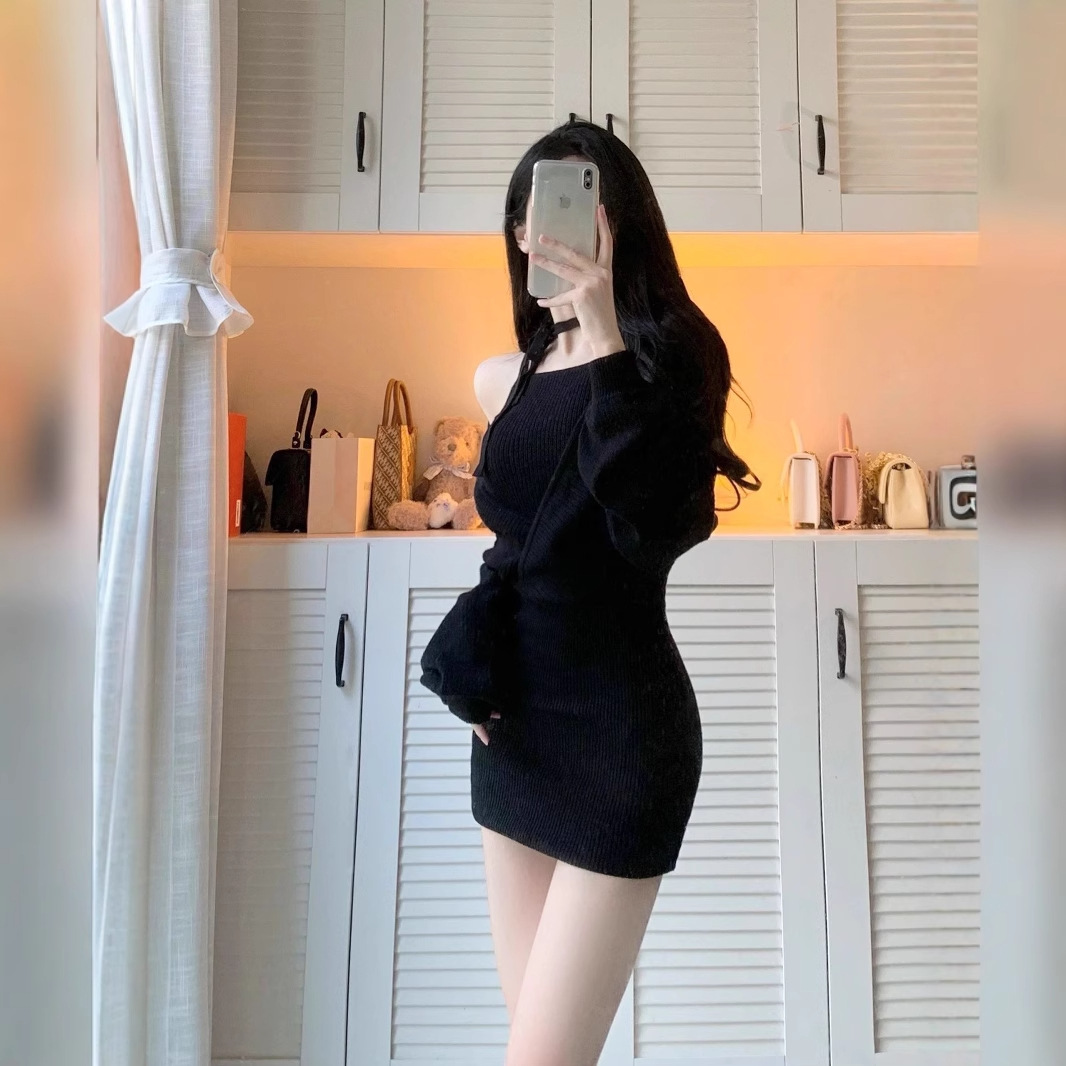 针织连衣裙女秋冬修身黑色露肩纯欲风性感紧身打底毛衣包臀连衣裙
