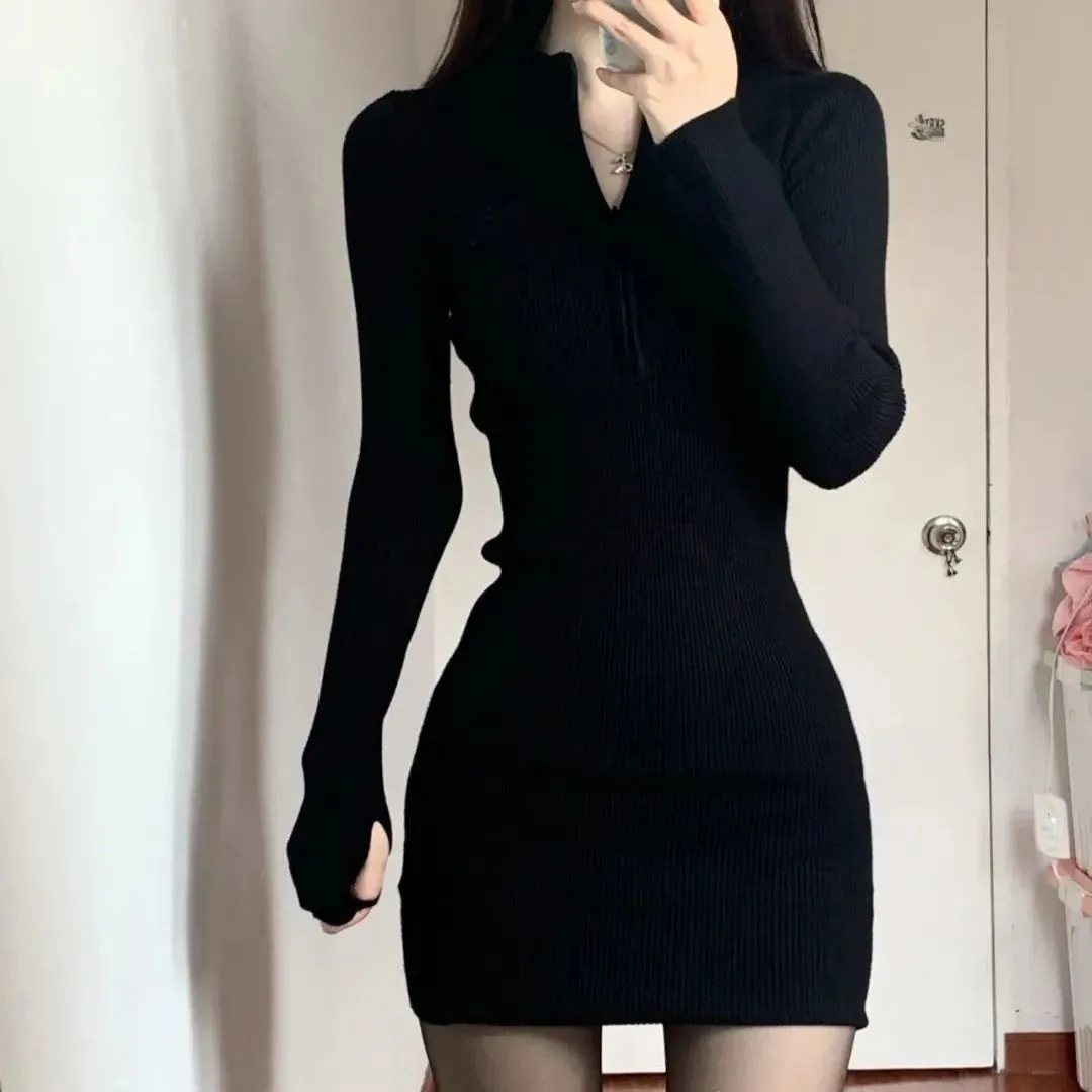 黑色辣妹连衣裙女针织秋冬打底包臀紧身夜店裙子修身内搭套装冬季