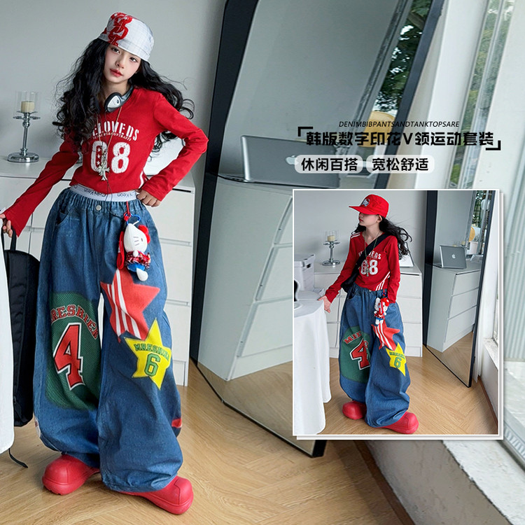 婴儿衣服男宝宝秋季运动T恤套装女童洋气红色打底潮牛仔裤二件套