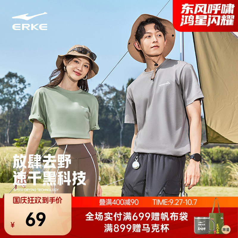 鸿星尔克短袖2025夏季新款男女情侣款新疆棉宽松山系运动速干t恤