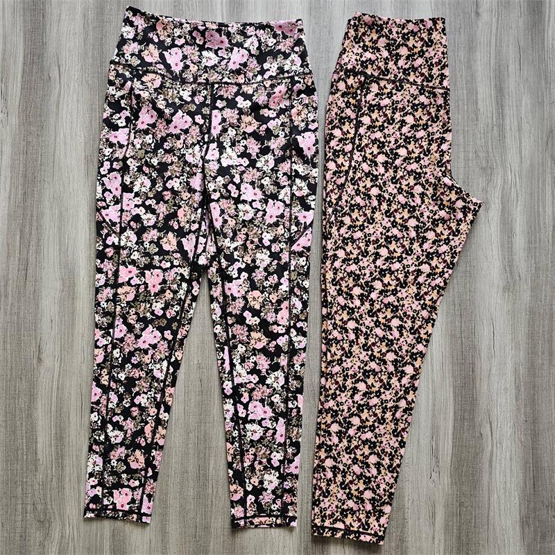 运动瑜伽裤女印花大码弹力高腰收腹性感花色速干时尚健身裤侧口袋