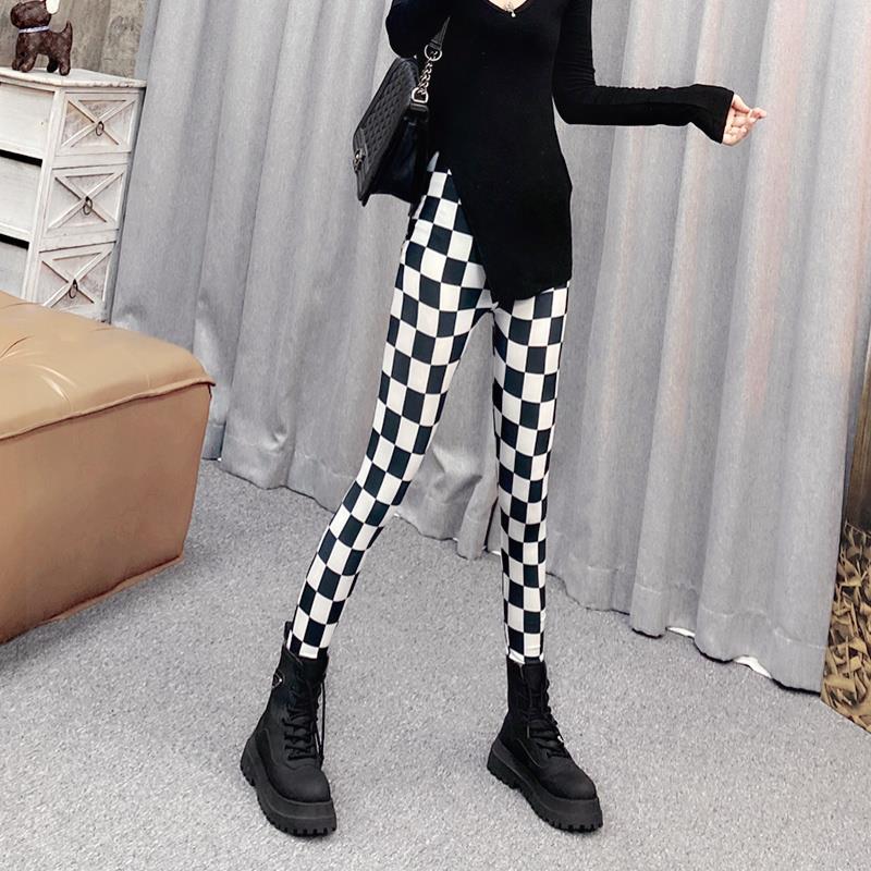新款打底裤女外穿加绒高腰黑白时尚花色弹力裤四季长裤瑜伽健身裤