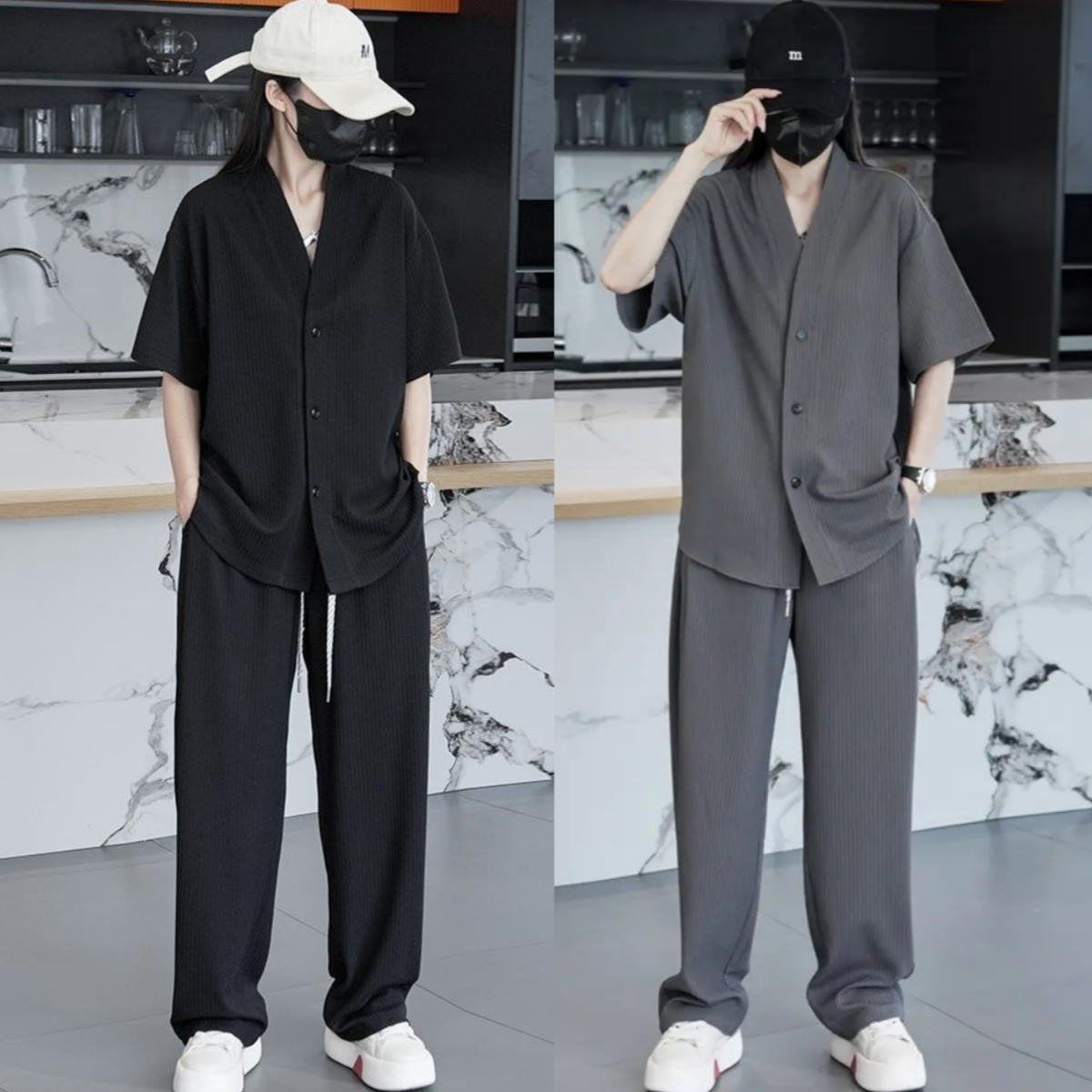 休闲运动套装男士华夫格夏季新款高端潮流时尚百搭半袖短裤两件套