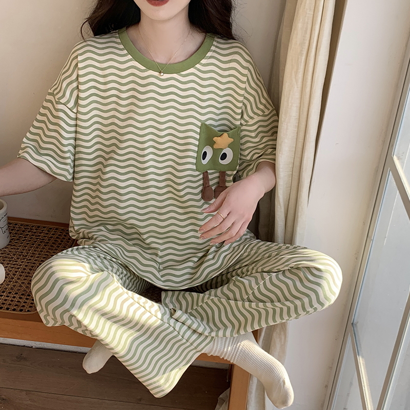 夏季短袖睡衣套装女条纹家居服薄款学生可外穿卡通休闲运动春秋天
