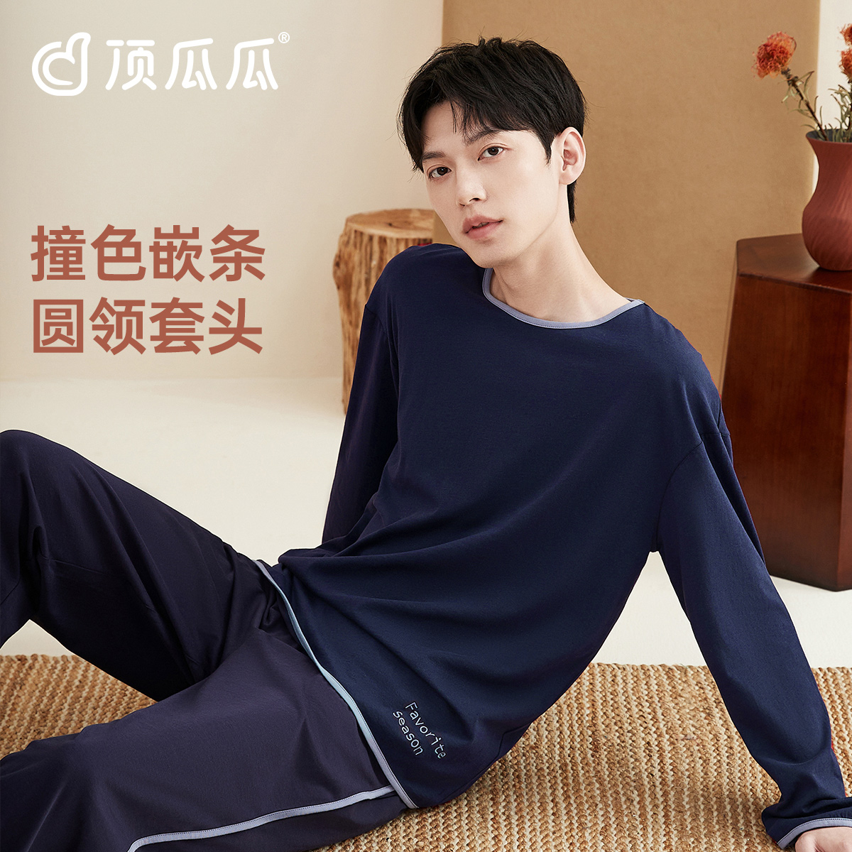 顶瓜瓜纯棉舒适睡衣男士春秋撞色运动套头长袖可外穿家居服套装