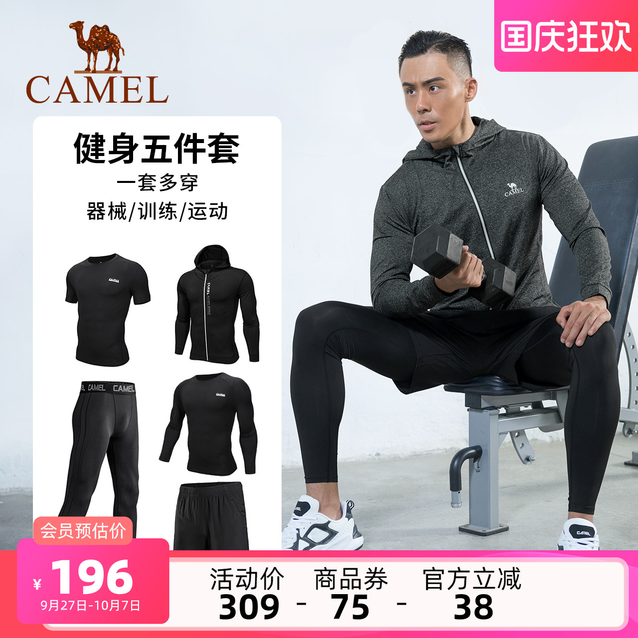 骆驼健身房长袖运动服跑步套装春夏男士晨跑速干紧身衣训练瑜伽服