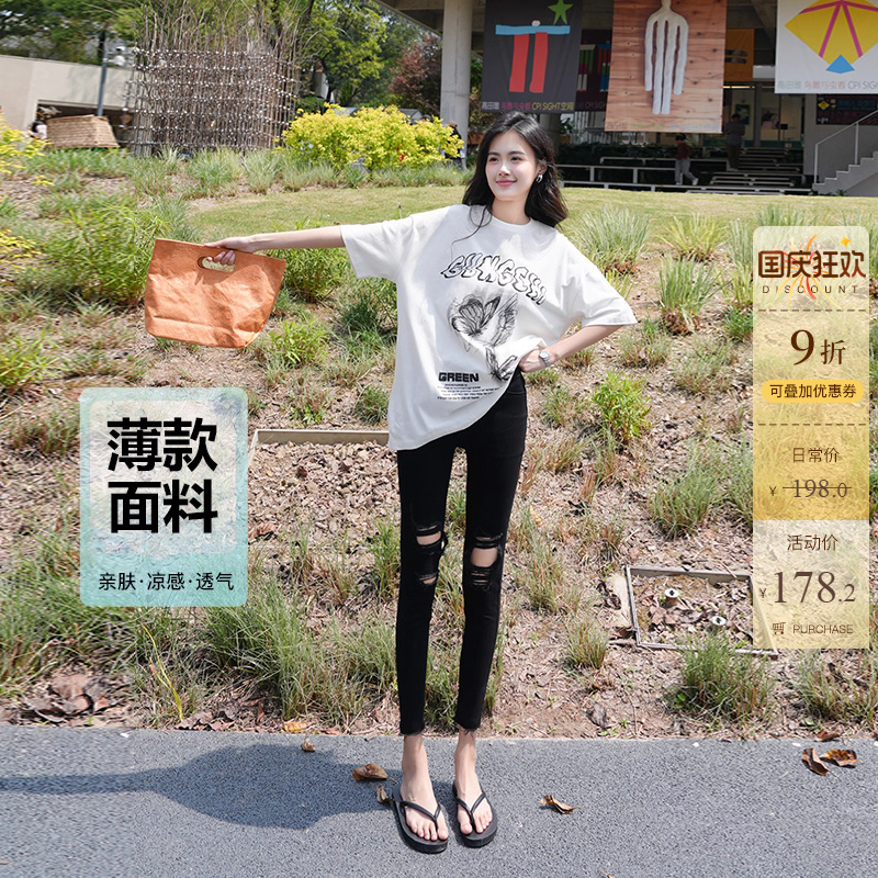 夏季薄款高弹力破洞牛仔裤女高腰纯黑色修身显瘦九分毛边小脚裤子