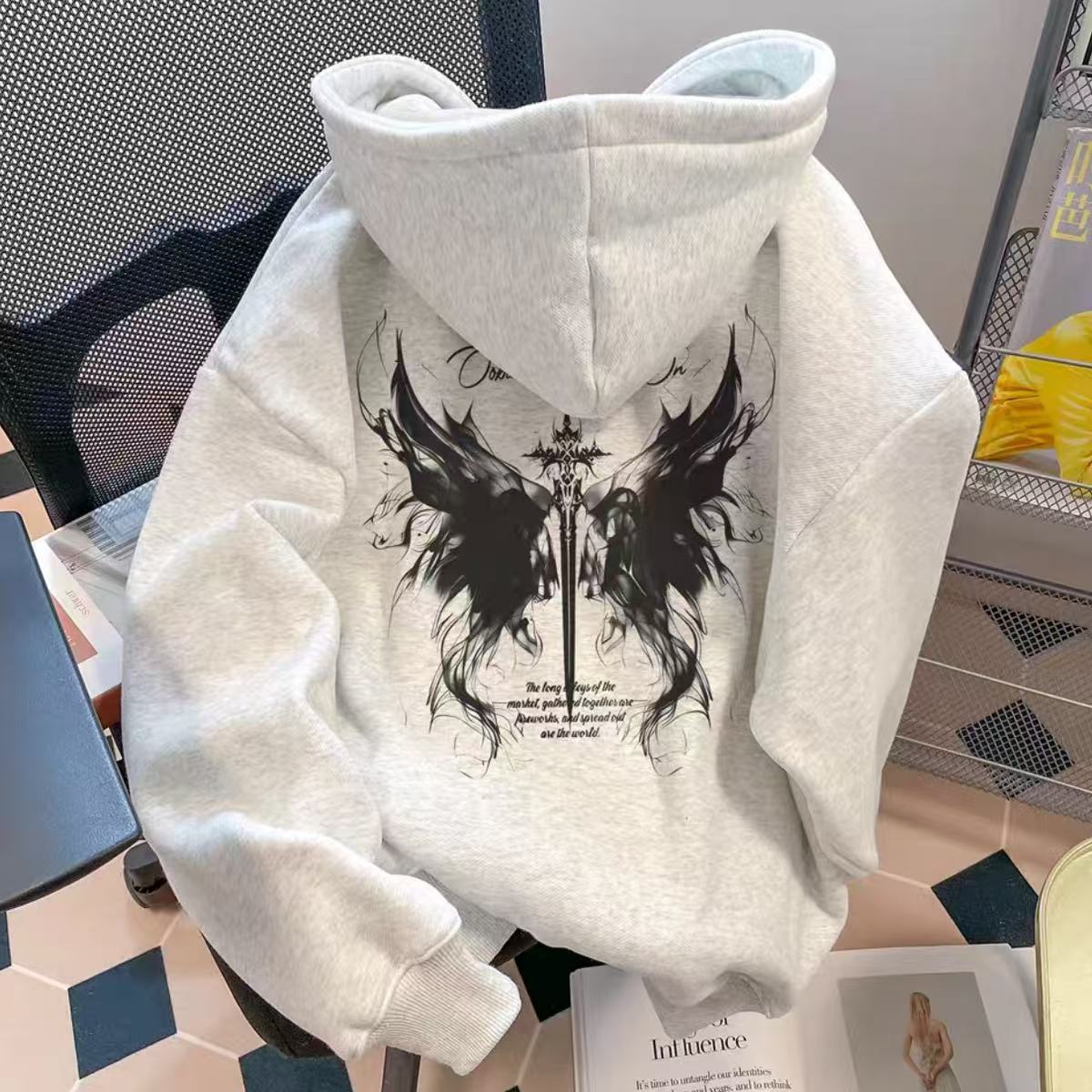 美式新款印花连帽卫衣男女秋冬加绒加厚百搭宽松情侣外套潮流上衣